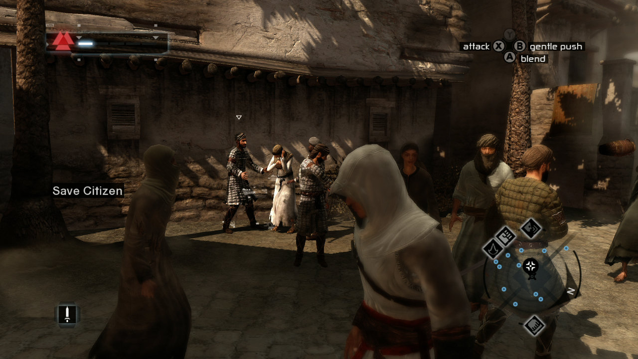 Lógicamente las palancas sirven para mover al personaje y a la cámara. Los botones del pad son las acciones contextuales, que según las circunstancias y nuestro “perfil” servirán para llevar a cabo unos movimientos u otros. ¿Qué es eso del perfil? Pues tan sencillo como que apretando uno u otro gatillo accedemos a los tres estilos. Por defecto el perfil activado sin pulsar ningún control es el bajo, con acciones como apartar a la gente, camuflarse, etc. Si pulsamos el gatillo izquierdo entramos en el que está orientado al ataque con acciones más violentas como golpear con el arma o arrojar al oponente al suelo. Por último el gatillo derecho tiene la función de desatar todo el potencial acrobático de Altair y abrir las posibilidades de saltos, escaladas y sprints.