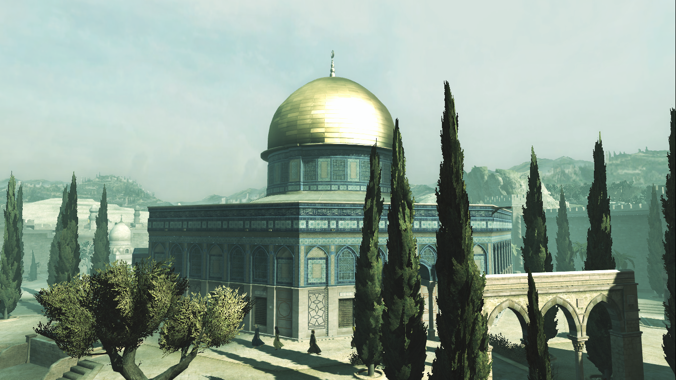 En primer lugar debemos señalar la perfecta recreación arquitectónica de las ciudades que se encuentran en el mapa del juego. Un auténtico placer pasearse por las calles de las urbes o por los puestos de mercaderes que salpican sus laberínticos mapeados, así como salir de ellas y observar en el horizonte el skyline de estos monumentales núcleos urbanos. Será, asimismo, imposible que no se nos pongan los pelos de punta cuando desde los tejados observamos por vez primera el sol filtrándose por entre las torres y atalayas de Jerusalén.