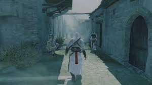 Una vez al corriente de nuestro objetivo deberemos viajar a la ciudad en cuestión. Para ello contamos con los establos en los exteriores de las ciudades, donde podremos agenciarse un caballo para desplazarnos entre ellas. La entrada a una urbe nos plantea el primer dilema de Assassin´s Creed. Las opciones son varias: Emplear la violencia contra los guardias, hacer una entrada rápida a galope tratando de evitarlos o, por el contrario, camuflarse entre un grupo de personas –monjes- y pasar inadvertido. Una vez hecho decidida y ejecutada la entrada, y cuando pisamos por primera vez una ciudad, resulta imprescindible explorar para descubrir las misiones, los lugares de interés y el emplazamiento de nuestros asistentes. El mapa en principio está “pelado” al entrar en un nuevo territorio, de modo que nuestra primera misión es llenarlo de referencias.