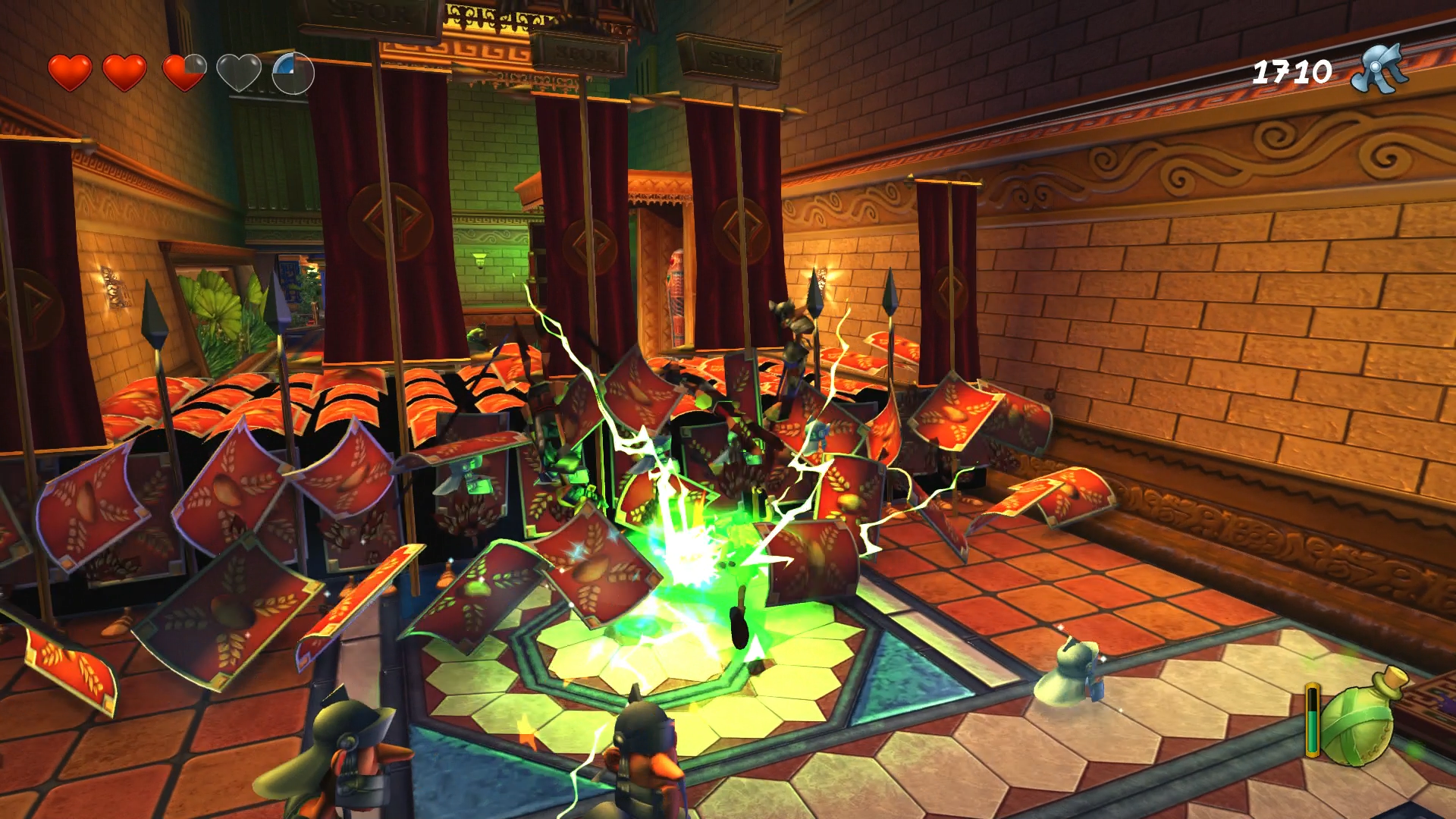 Pero por supuesto, si hablamos de acción en batallas, tendríamos que tener alguien con quien combatir. Y así será, encontraremos más de 30 tipos de rivales a abatir, desde soldados básicos a otros más curiosos como «Sonics», el soldado Marius con aquac, otros sospechosamente parecidos a Rayman, e incluso Pokéballs voladoras. Desde luego encontraremos jefes de final de fase, el primero de ellos será un grupo de romanos que, ¡sorpresa!, es un calco al primer enemigo del clásico juego de recreativas. ¿Guiño? Probablemente, y muy agradable. Otros enemigos como un montón de clones de César, o un enorme gigante que debemos atontar lanzándole columnas de piedra a la cabeza, proporcionan diversión para rato, y averiguar sus puntos débiles, por supuesto.